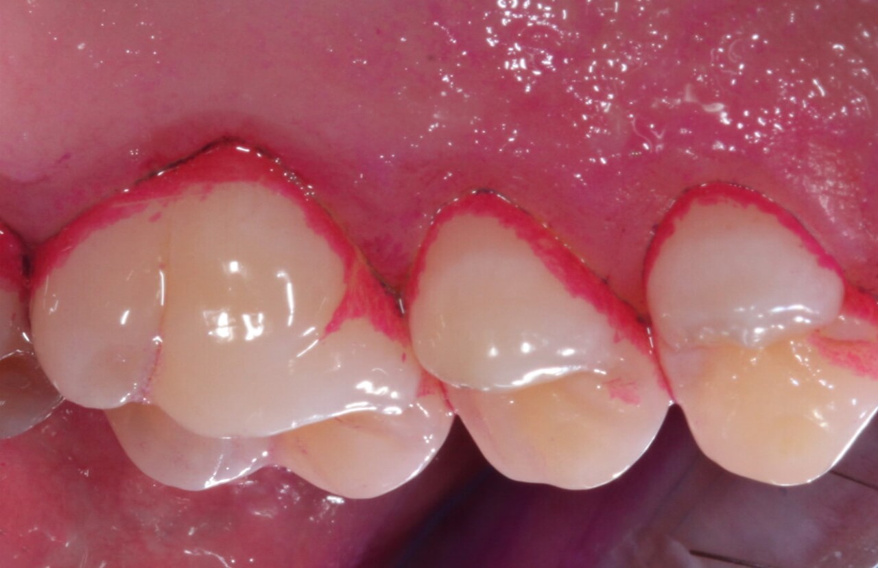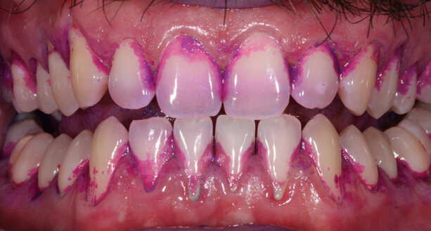 Durch anfärben der Zahnbeläge wird deutlich, dass gerade die wichtigen Stellen von der Zahnbürste nicht erfasst werden: