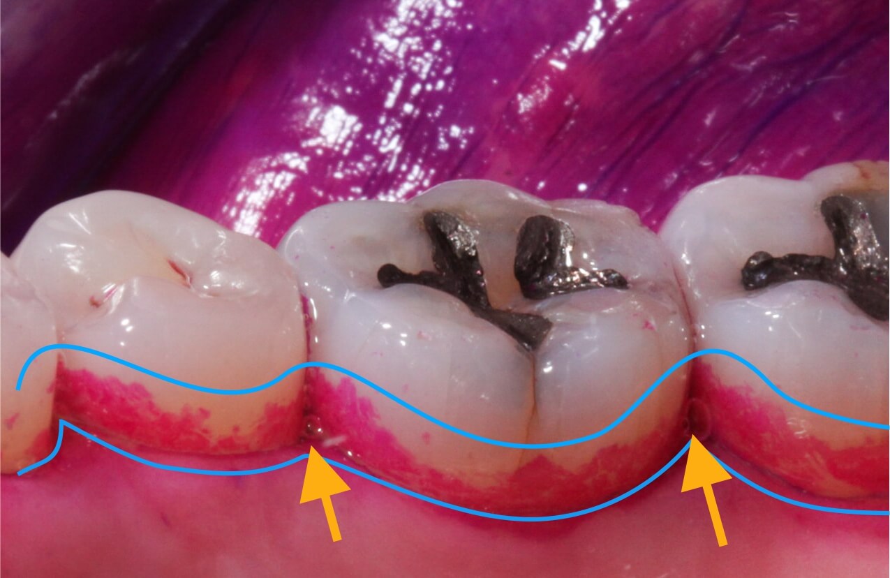 Die Zahnfleischränder und die Zahnzwischenräume (Pfeile) sind voller Bakterien, die durch Farbe sichtbar gemacht sind.