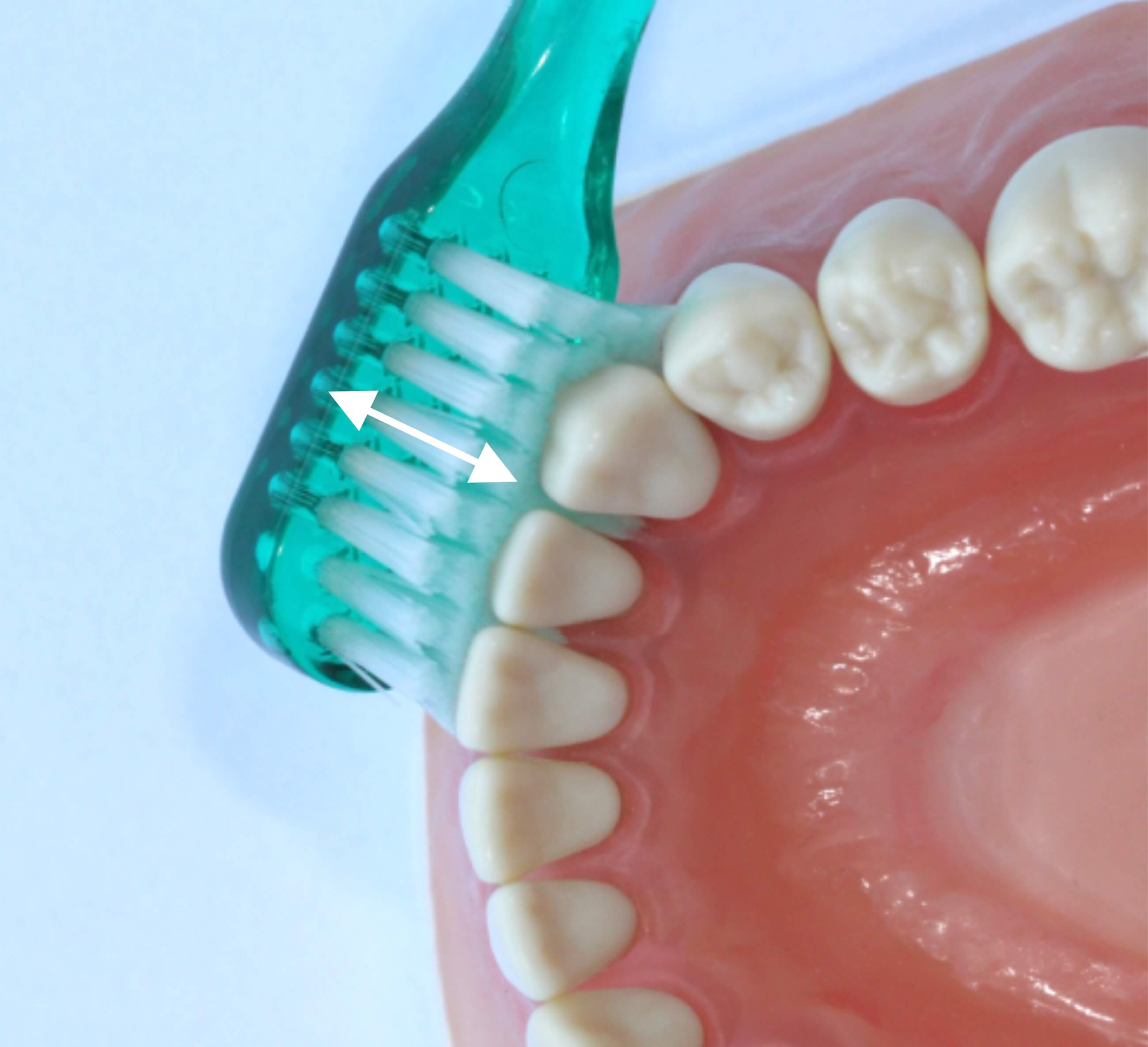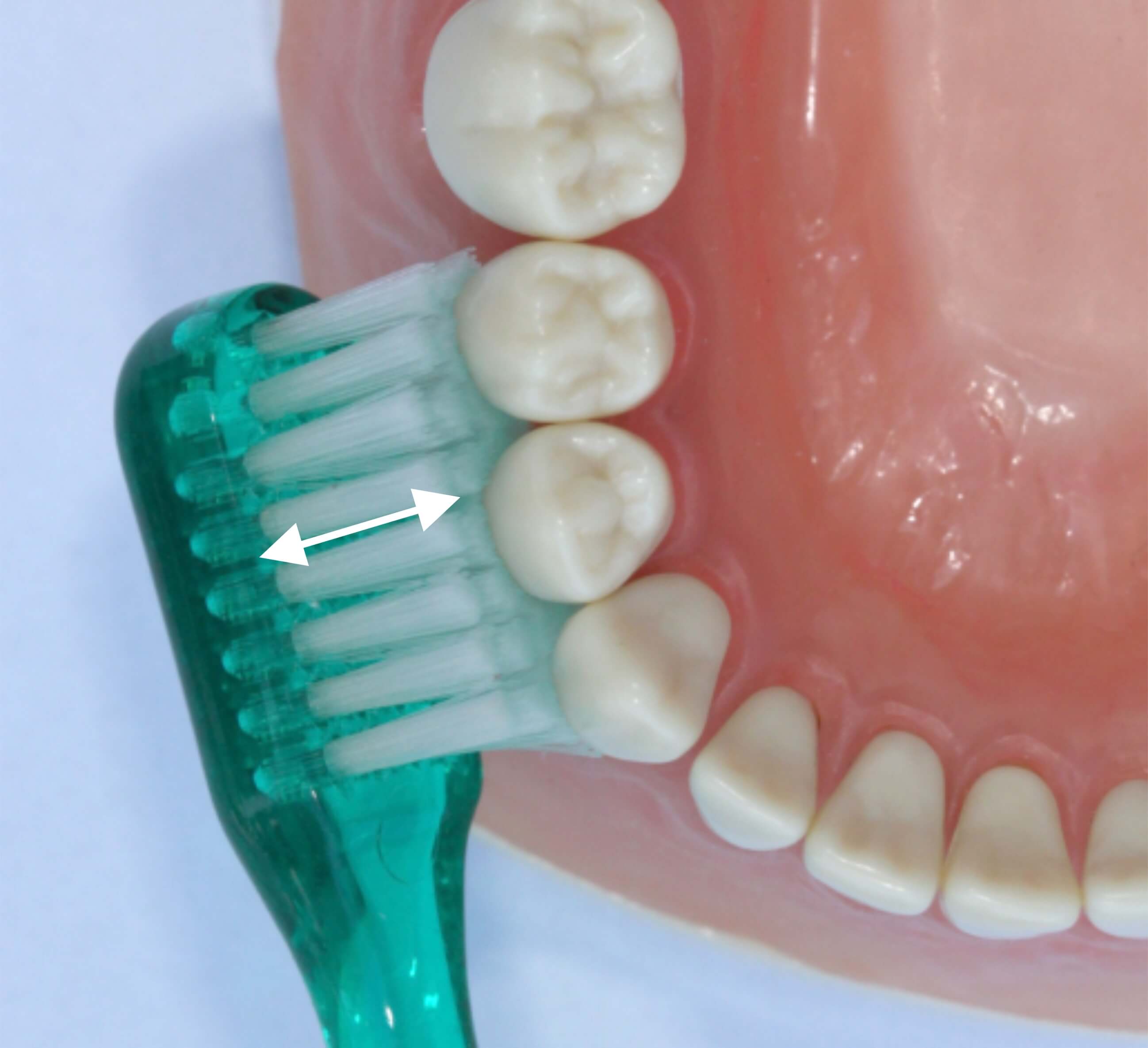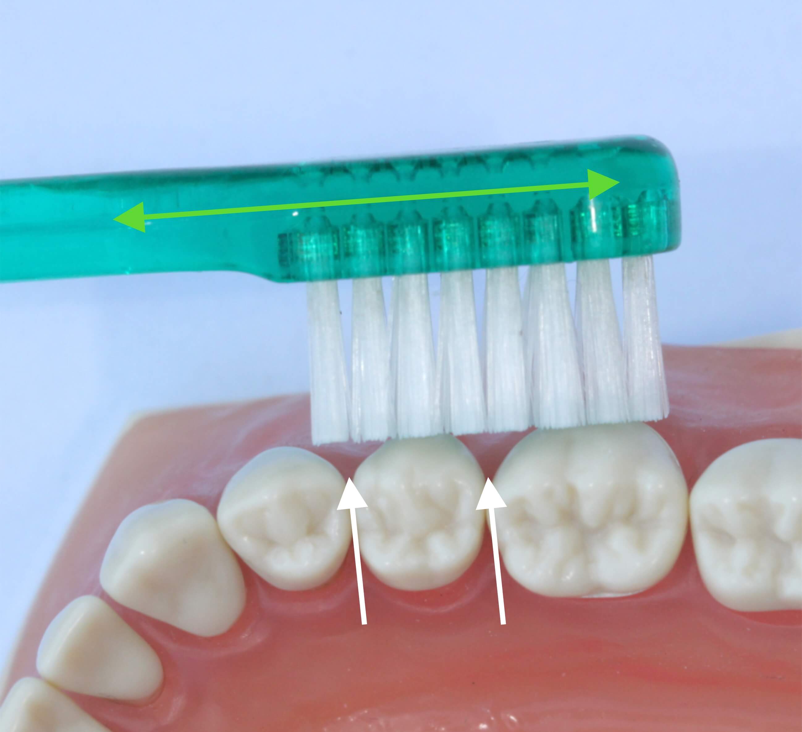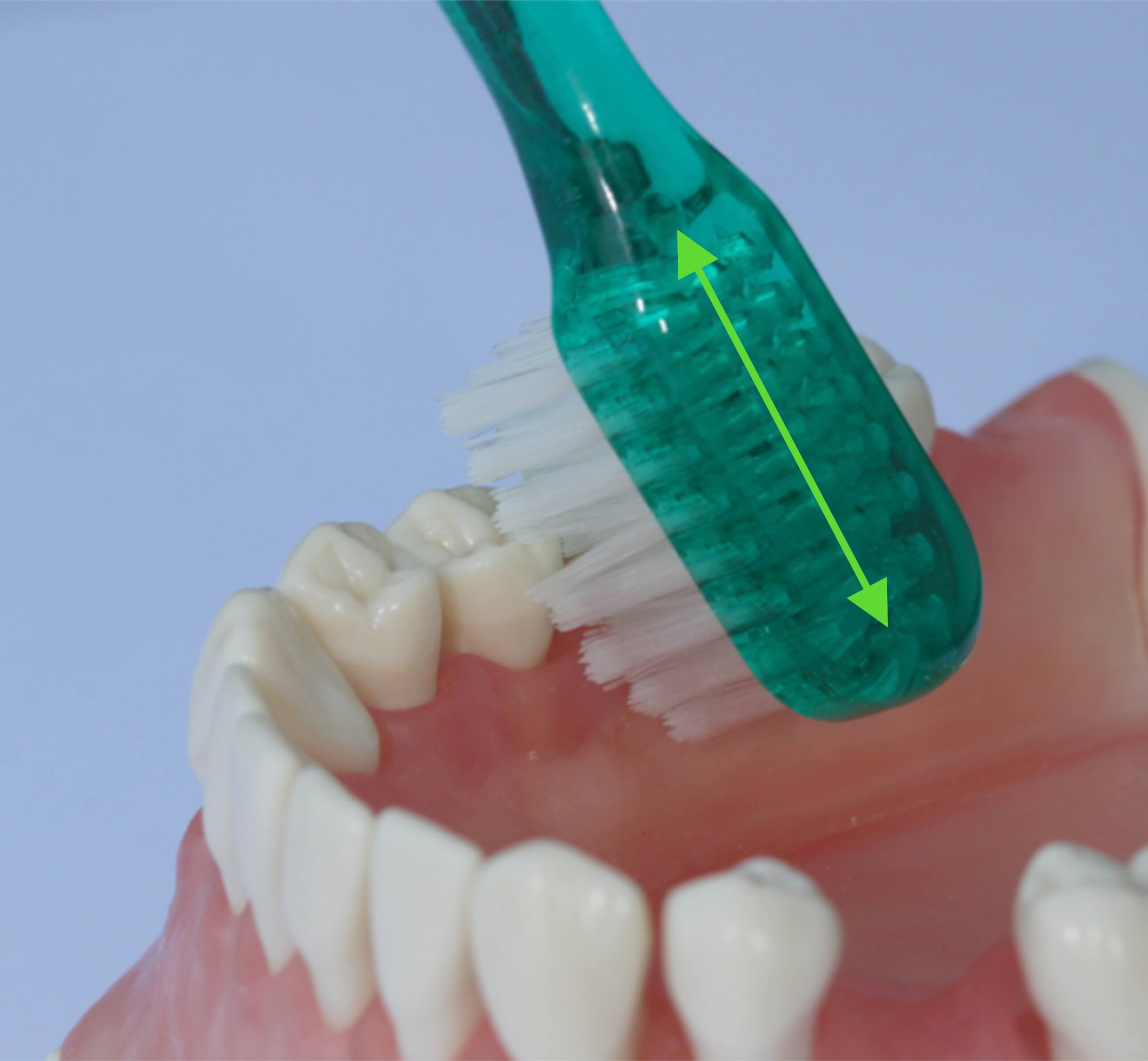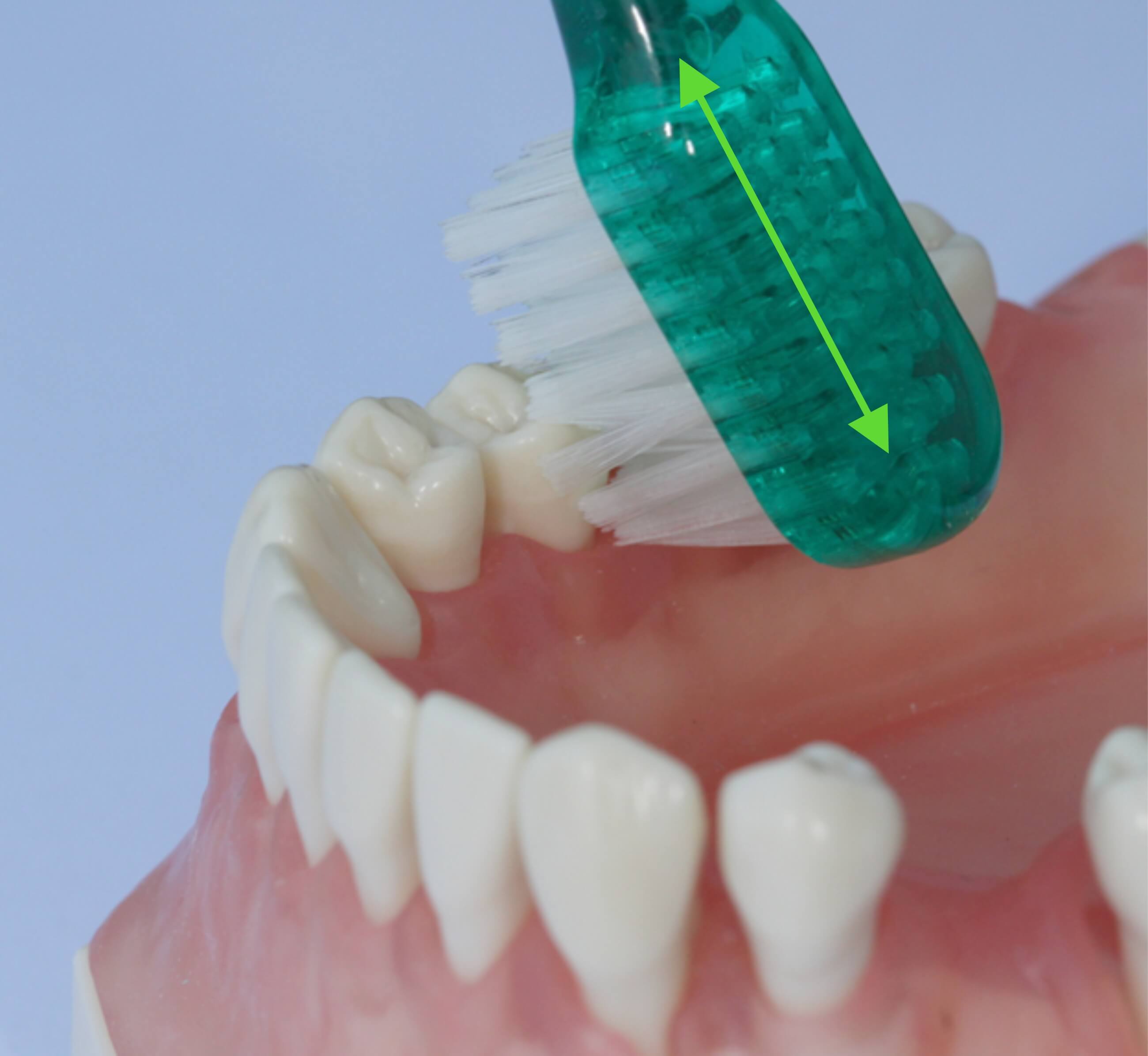 Um noch tiefer in die Zwischenräume einzudringen, wird die Bürste in die Kaufläche gedreht, sodass die Borsten leicht in Richtung Kaufläche bzw. Schneidekante gerichtet sind. Die Bewegung besteht aus kurzen, wiederholten Bewegungen vom Zahnfleisch in Richtung Zahn - in Längsrichtung der Borsten (Pfeil).