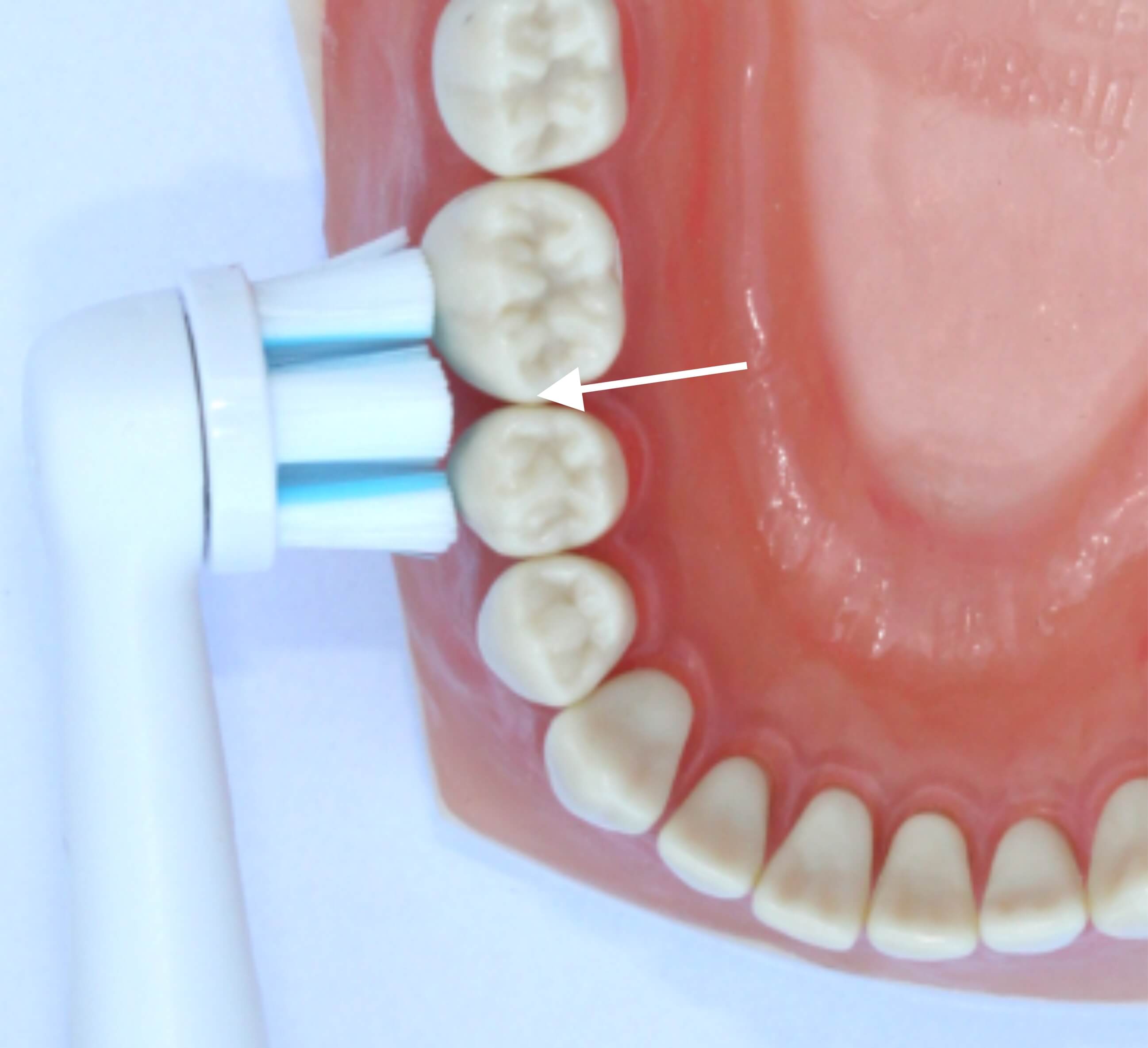 Durch Drehung der Bürste zeigen die Borsten in Richtung Zahnfleischrand und sie schmiegen sich in die Zwischenräume, so bekommen Sie diese wichtigen Stellen sauber.
