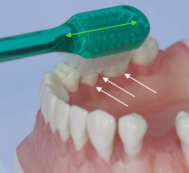 Um noch tiefer in die Zwischenräume einzudringen, wird die Bürste in die Kaufläche gedreht, sodass die Borsten leicht in Richtung Kaufläche bzw. Schneidekante gerichtet sind. Die Bewegung besteht aus kurzen, wiederholten Bewegungen vom Zahnfleisch in Richtung Zahn - in Längsrichtung der Borsten (Pfeil).