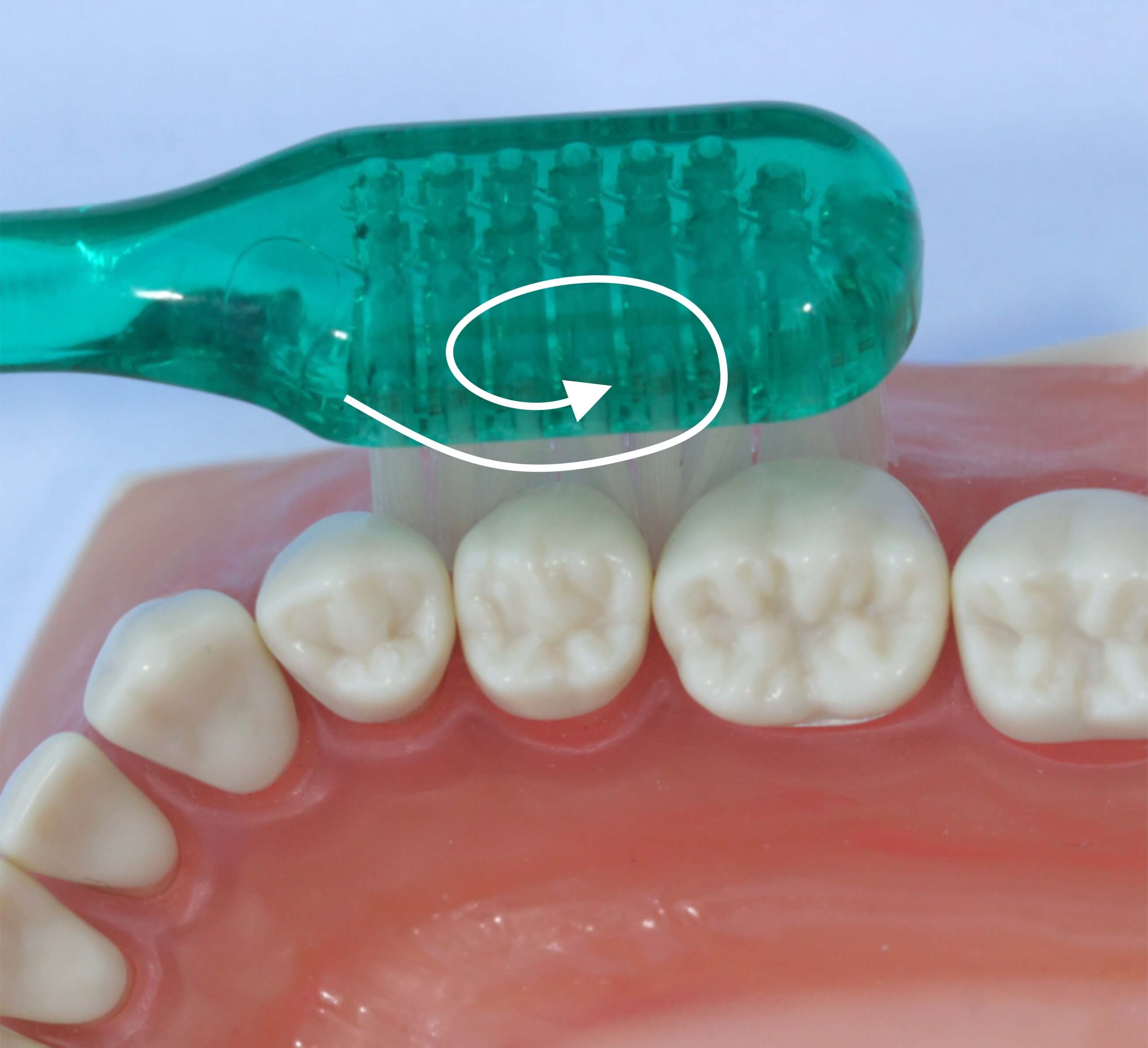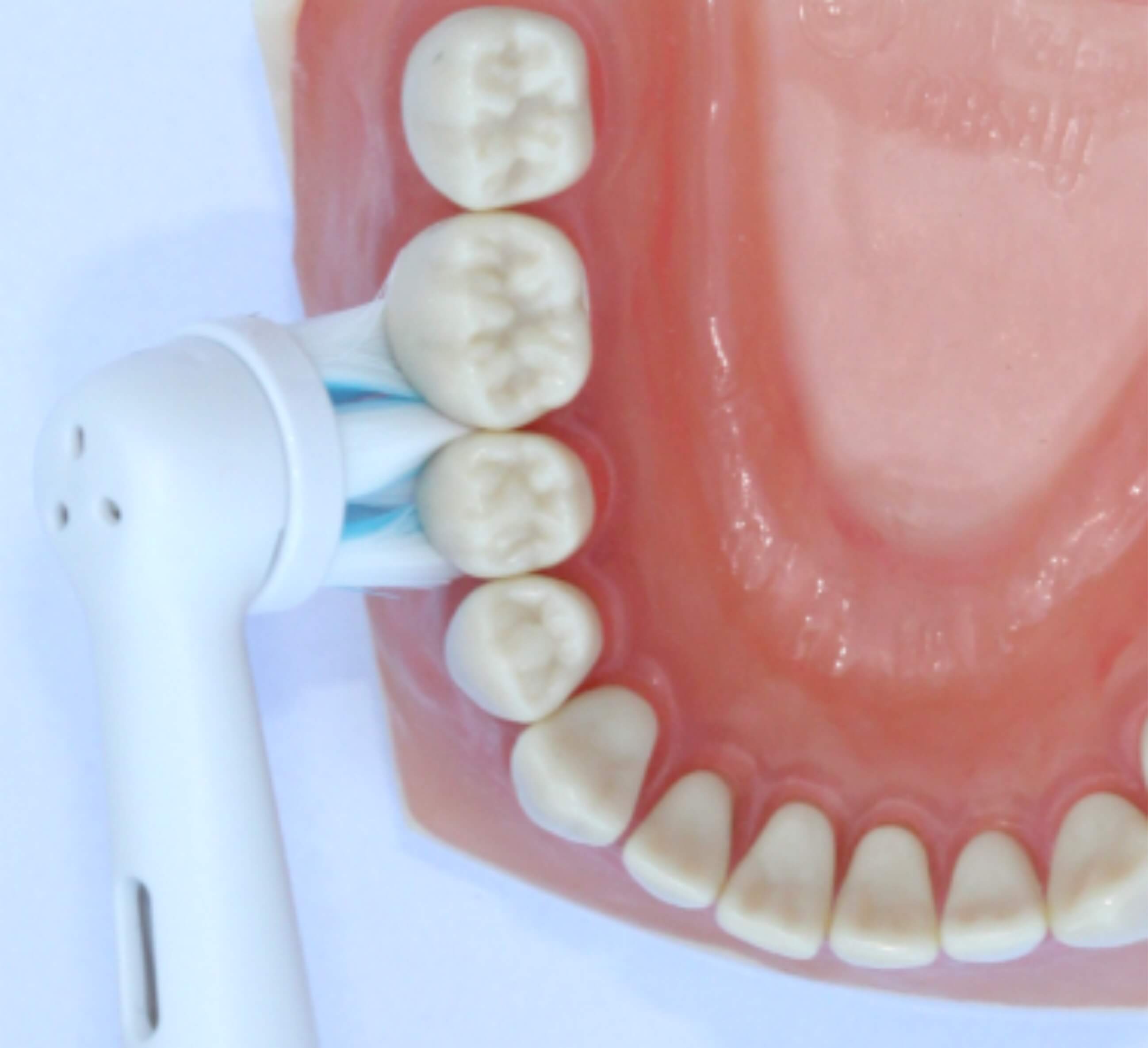 Durch Drehung der Bürste zeigen die Borsten in Richtung Zahnfleischrand und sie schmiegen sich in die Zwischenräume, so bekommen Sie diese wichtigen Stellen sauber.