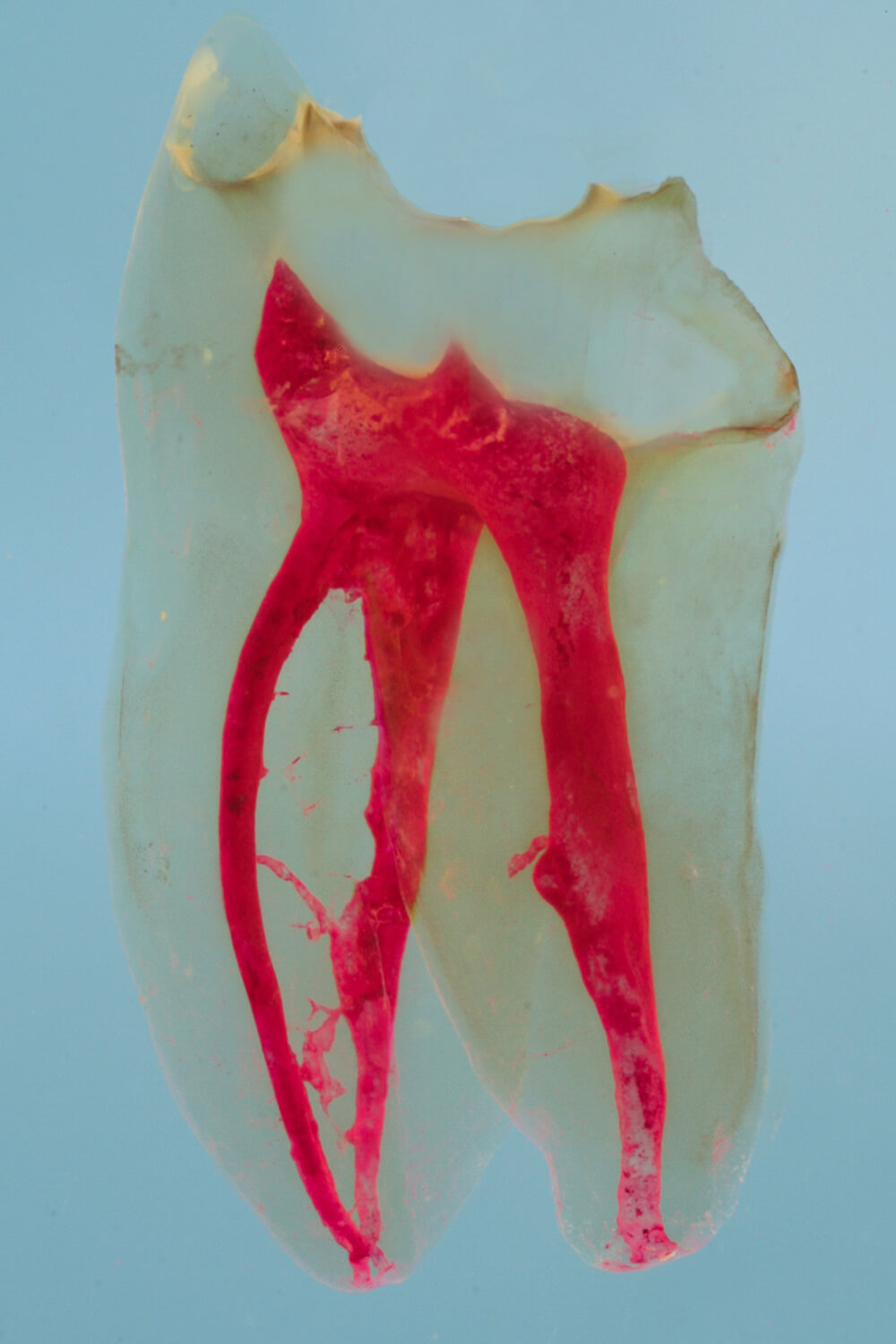 Ein unbehandelter unterer Backenzahn als transparentes Präparat mit rot dargestellten Pulpahohlräumen. Dieser Zahn hat zwei Wurzeln und drei sehr unterschiedlich geformte Wurzelkanäle. In gesundem Zustand ist hier durchblutetes, lebendes Pulpagewebe (landläufig „Nerv des Zahns“ oder Zahnmarkorgan). Dringen Keime in größeren Mengen ins Innere ein, z. B. durch tiefe Karies oder durch Risse in der Zahnkrone, reagiert die Pulpa mit Entzündung und nach einiger Zeit stirbt das Markorgan ab. Nachfolgend breiten sich die Keime dann in den gesamten Hohlraumsystemen aus und vermehren sich. Sie bleiben aber nicht nur im inneren der Wurzeln, sondern entweichen über natürliche Verbindungswege aus den Wurzelkanälen in den Kieferbereich um die Wurzelspitzen. Die dort einsetzende Entzündung (Abwehrkampf des Immunsystems) ist häufig mit Schmerzen verbunden.