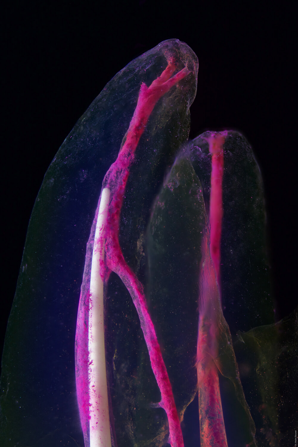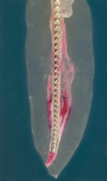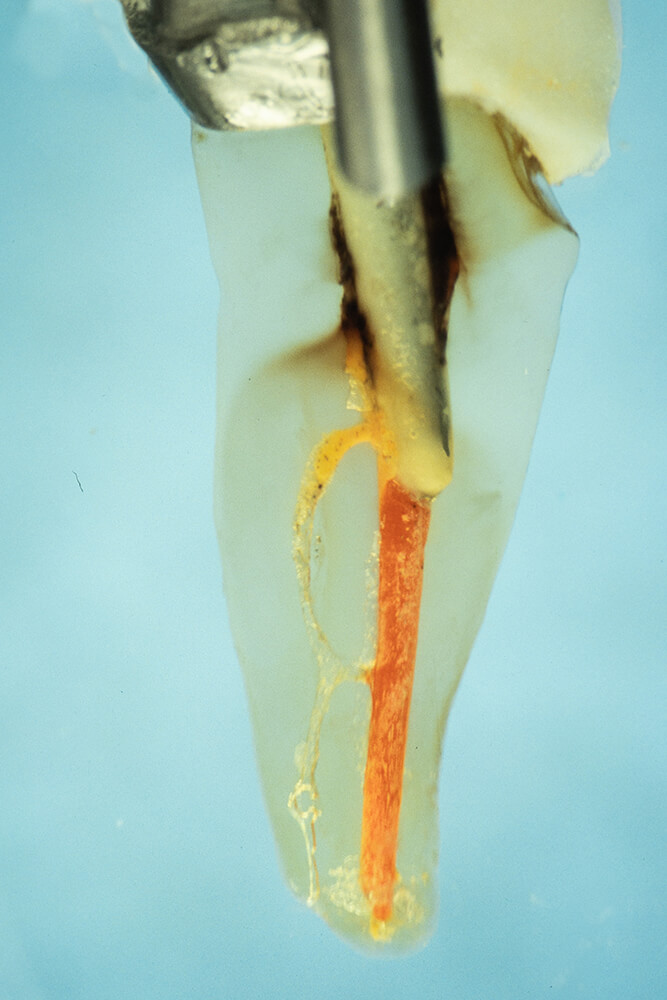 Ein unterer Schneidezahn mit rot angefärbten Pulpahohlräumen und einem Wurzelkanalinstrument, das zur Reinigung und mechanischen Erweiterung des Wurzelkanalsystems verwendet wird.